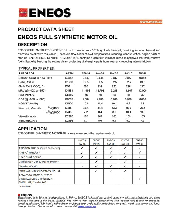 ENEOS 5W-20 Fully Synthetic Motor Oil is 100% fully synthetic motor oil that provides excellent engine cleanliness and wear resistance due to its high-performance base oil and additive blend.