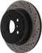 StopTech Drilled and Slotted Sport Rotors are 1-piece direct replacement brake discs for factory brake systems and stock calipers that look great behind your wheels – and offer significantly improved braking performance. The unique cross-drilling and slotting aids with heat and brake dust dispersal; prevents glazing of the pads; adds bite and improves wet and dry braking performance. Built to last; the black e-coating provides protection from corrosion and the high carbon metallurgy (in most applications) offers quieter operation; better crack resistance and increased performance.