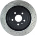 StopTech Drilled and Slotted Sport Rotors are 1-piece direct replacement brake discs for factory brake systems and stock calipers that look great behind your wheels – and offer significantly improved braking performance. The unique cross-drilling and slotting aids with heat and brake dust dispersal; prevents glazing of the pads; adds bite and improves wet and dry braking performance. Built to last; the black e-coating provides protection from corrosion and the high carbon metallurgy (in most applications) offers quieter operation; better crack resistance and increased performance.