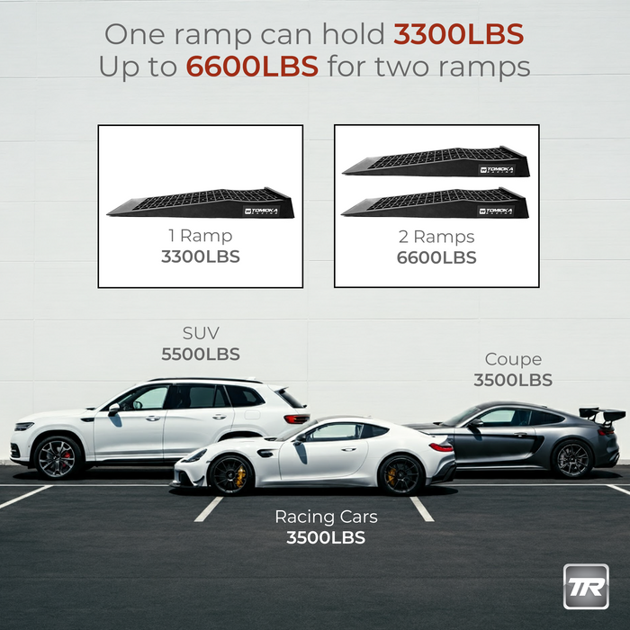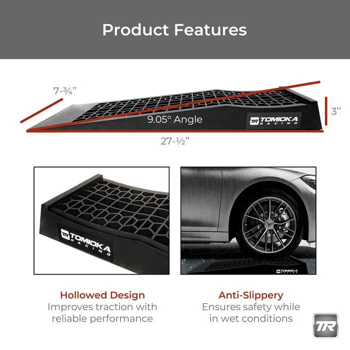 The Tomioka Racing Super Slopes are designed to help car enthusiast with lowered vehicles to reach all front, side and rear jack point areas. Made of strong plastic material, they only weigh in at 5LBS each with dimensions of 27x8x3 inches. These light weight and easy to store ramps will be the only thing you'll need to help jack up your lowered vehicle.