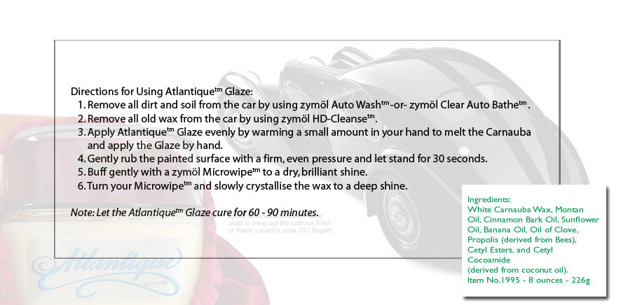 Atlantique Glaze is based on a custom formula developed for Ralph Lauren’s 1937 Bugatti Type 57SC Atlantique. As with many Zymöl prepared cars, the Bugatti won “Best of Show” at the Pebble Beach Concours d’Elegance in 1990.