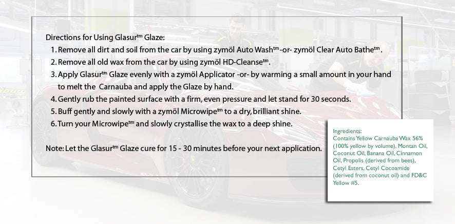 Apply Glasur™ Glaze evenly with a Zymöl Applicator or by warming a small amount in your hand to melt the Carnauba and apply the Glaze by hand.